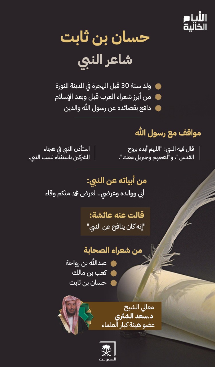 حسان بن ثابت من أبرز شعراء العرب قبل وبعد الإسلام، ودافع بقصائده عن رسول الله والدين.