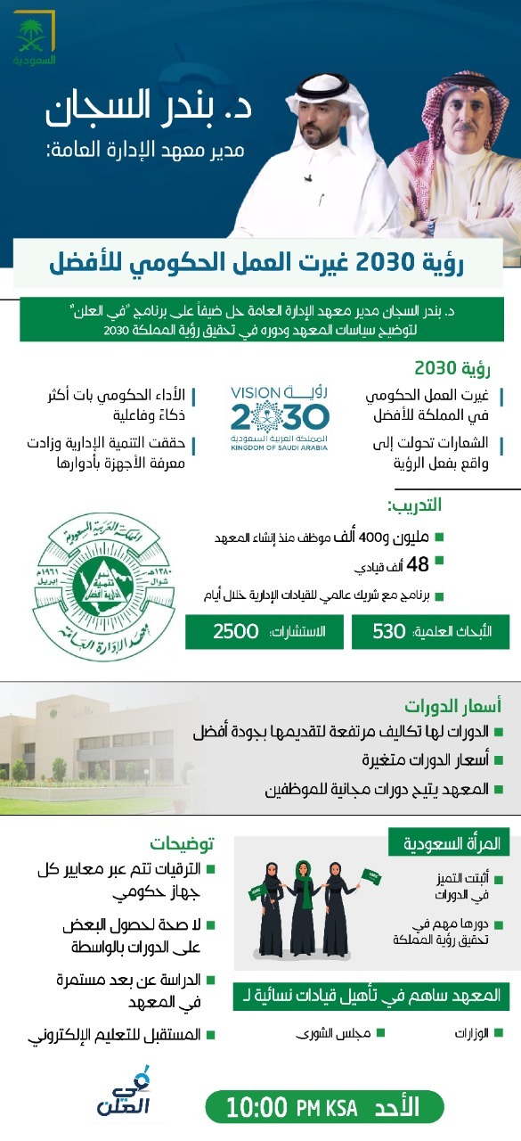 إنفوجرافيك| د. بندر السجان مدير معهد الإدارة العامة: رؤية 2030 غيرت العمل الحكومي للأفضل